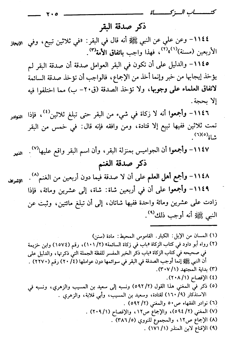 ١١٤٤ - وعن علي عن النبي صلى الله عليه وسلم أنه قال في البقر: «في ثلاثين تبيع، وفي الأربعين (مسنة)»، فهذا واجب باتفاق الأمة.