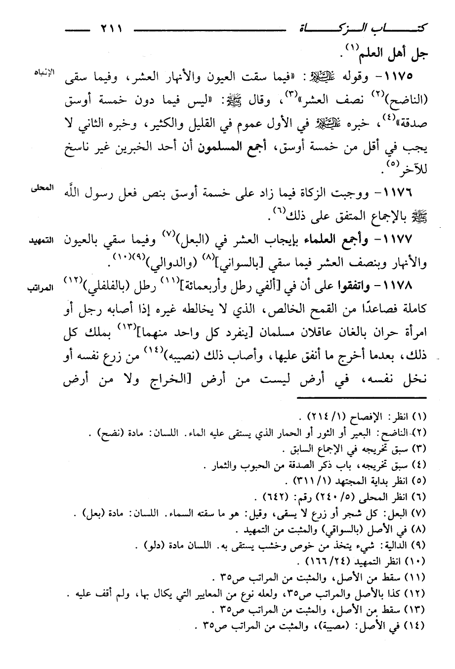 ١١٧٧ - وأجمع العلماء بإيجاب العشر في (البعل) وفيما سقي بالعيون والأنهار وبنصف العشر فيما سقي [بالسوان] (والدوالي).