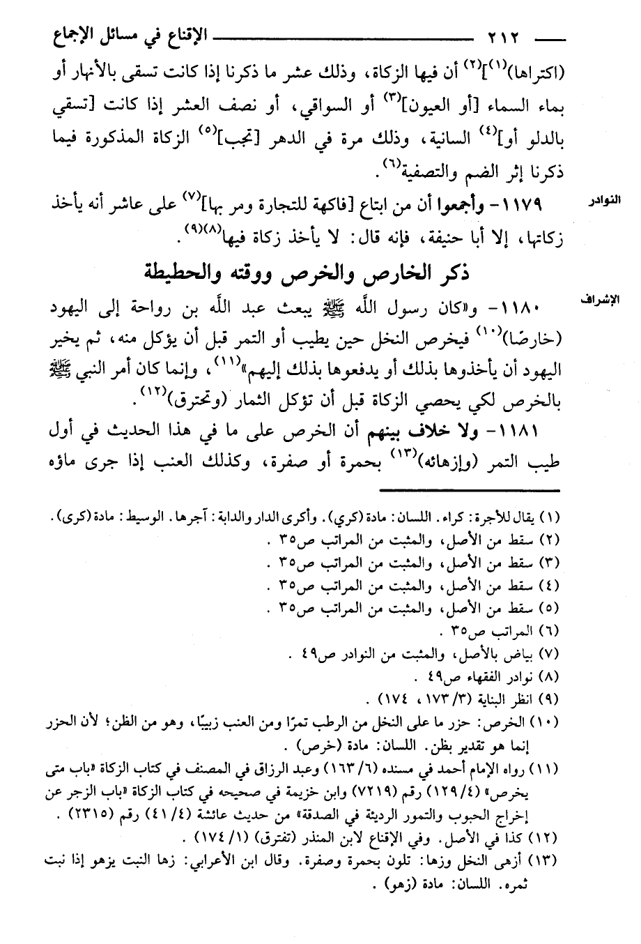 ١١٨٠ - و «كان رسول الله صلى الله عليه وسلم يبعث عبد الله بن رواحة إلى اليهود (خارصًا) فيخرص النخل حين يطيب أو التمر قبل أن يؤكل منه، ثم يخير اليهود أن يأخذوها بذلك أو يدفعوها بذلك إليهم»، وإنما كان أمر النبي صلى الله عليه وسلم بالخرص لكي يحصي الزكاة قبل أن تؤكل الثمار (وتحترق).