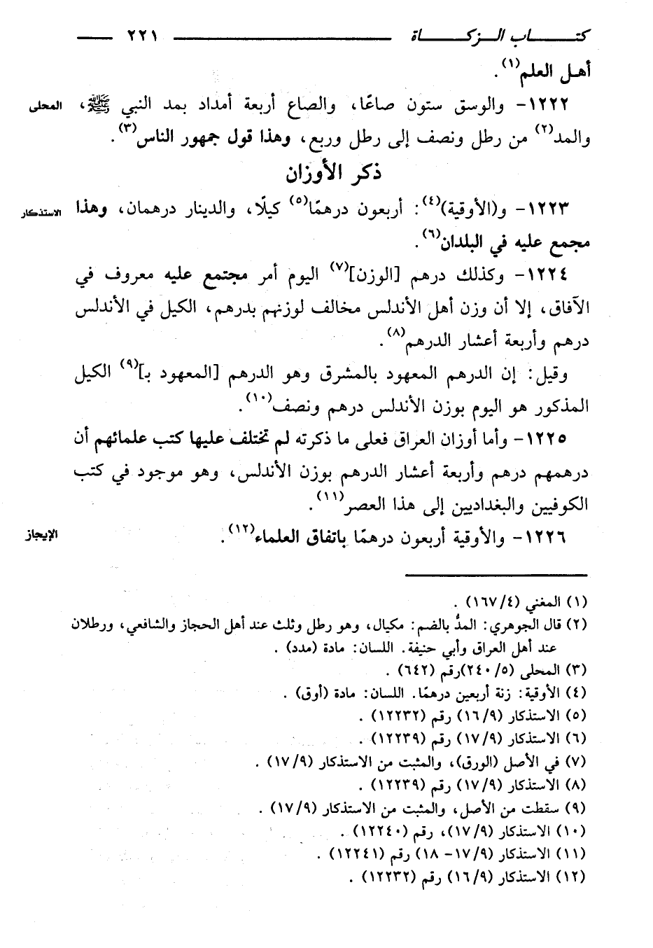 ١٢٢٣ - و (الأوقية): أربعون درهمًا كيلا، والدينار درهمان، وهذا مجمع عليه في البلدان.
