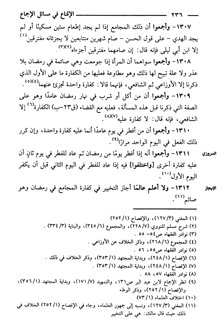١٣١٠ - وأجمعوا أن من أفطر في يوم عامدًا أنما عليه كفارة واحدة، وإن كرر ذلك الفعل في اليوم الواحد مرارًا.
