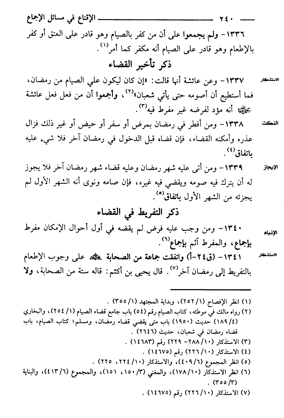 ١٣٣٧ - وعن عائشة أنها قالت: «إن كان ليكون على الصيام من رمضان، فما أستطيع أن أصومه حتى يأتي شعبان»، وأجمعوا أن من فعل فعل عائشة رضي الله عنها أنه مؤد لفرض غير مفرط فيه.