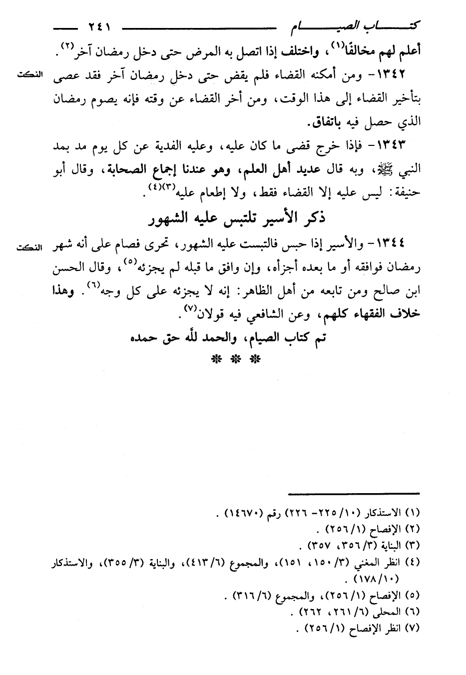 ١٣٤٣ - فإذا خرج قضى ما كان عليه، وعليه الفدية عن كل يوم مد بمد النبي صلى الله عليه وسلم، وبه قال عديد أهل العلم، وهو عندنا إجماع الصحابة، وقال أبو حنيفة: ليس عليه إلا القضاء فقط، ولا إطعام عليه.