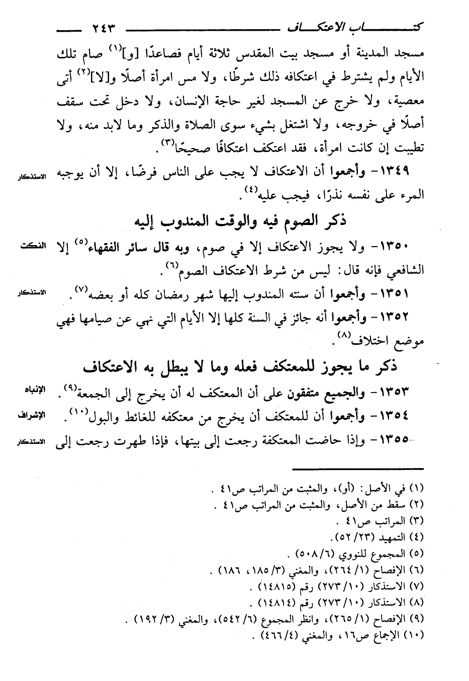١٣٥٠ - ولا يجوز الاعتكاف إلا في صوم، وبه قال سائر الفقهاء إلا الشافعي فإنه قال: ليس من شرط الاعتكاف الصوم.