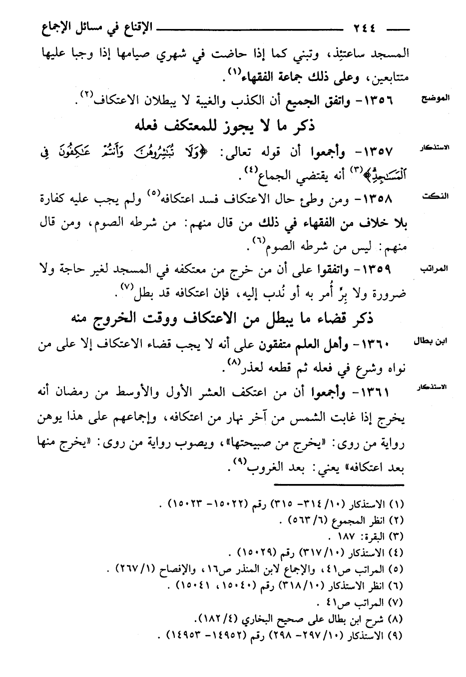 ١٣٦١ - وأجمعوا أن من اعتكف العشر الأول والأوسط من رمضان أنه يخرج إذا غابت الشمس من آخر نهار من اعتكافه، وإجماعهم على هذا يوهن رواية من روى: «يخرج من صبيحتها»، ويصوب رواية من روى: «يخرج منها بعد اعتكافه» يعني: بعد الغروب.