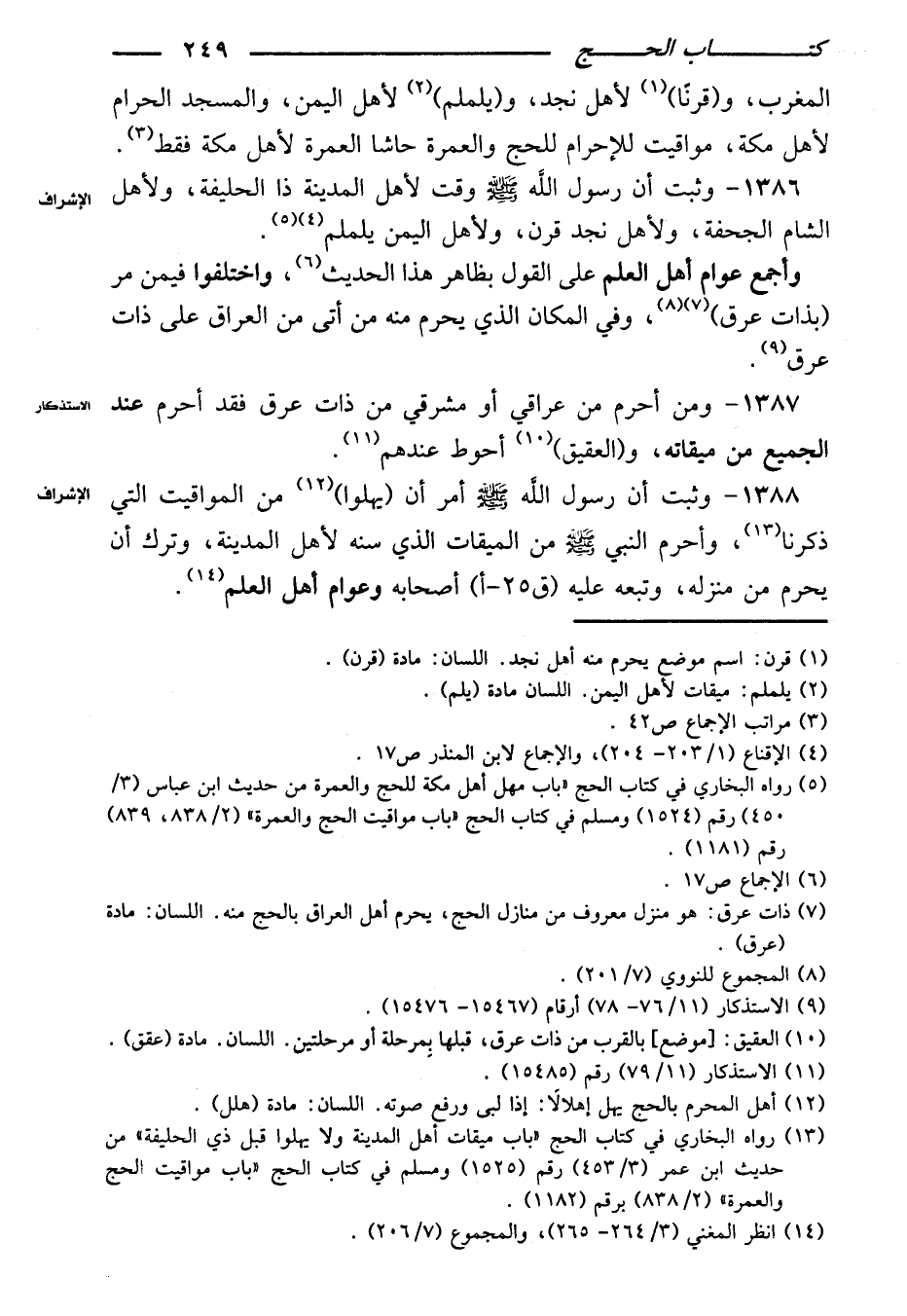 ١٣٨٦ - وثبت أن رسول الله صلى الله عليه وسلم وقت لأهل المدينة ذا الحليفة، ولأهل الشام الجحفة، ولأهل نجد قرن، ولأهل اليمن يلملم.