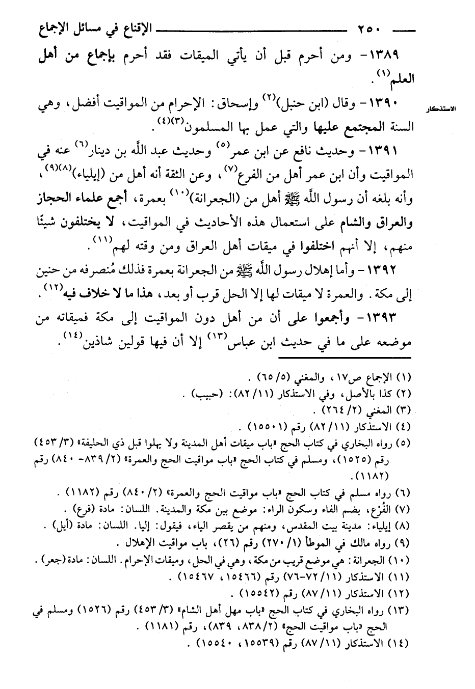 ١٣٩١ - وحديث نافع عن ابن عمر وحديث عبد الله بن دينار عنه في المواقيت وأن ابن عمر أهل من الفرع، وعن الثقة أنه أهل من (إيلياء)، وأنه بلغه أن رسول الله صلى الله عليه وسلم أهل من (الجعرانية) بعمرة، أجمع علماء الحجاز والعراق والشام على استعمال هذه الأحاديث في المواقيت، لا يختلفون شيئًا منهم، إلا أنهم اختلفوا في ميقات أهل العراق ومن وقته لهم.