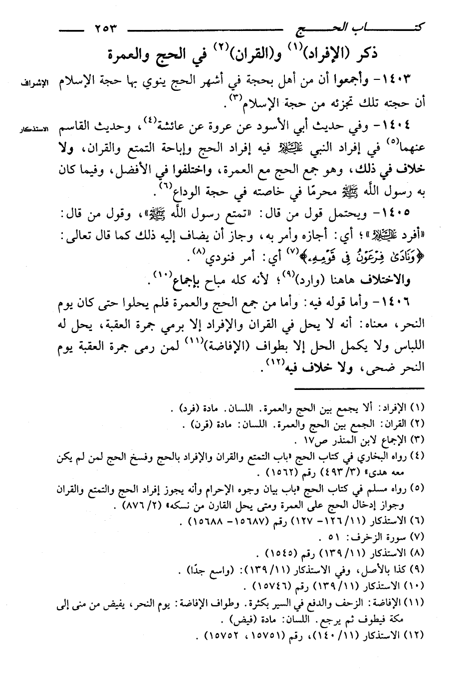 ١٤٠٤ - وفي حديث أبي الأسود عن عروة عن عائشة، وحديث القاسم عنهما في إفراد النبي عليه السلام فيه إفراد الحج وإباحة التمتع والقران، ولا خلاف في ذلك، وهو جمع الحج مع العمرة، واختلفوا في الأفضل، وفيما كان به رسول الله صلى الله عليه وسلم محرمًا في خاصته في حجة الوداع.