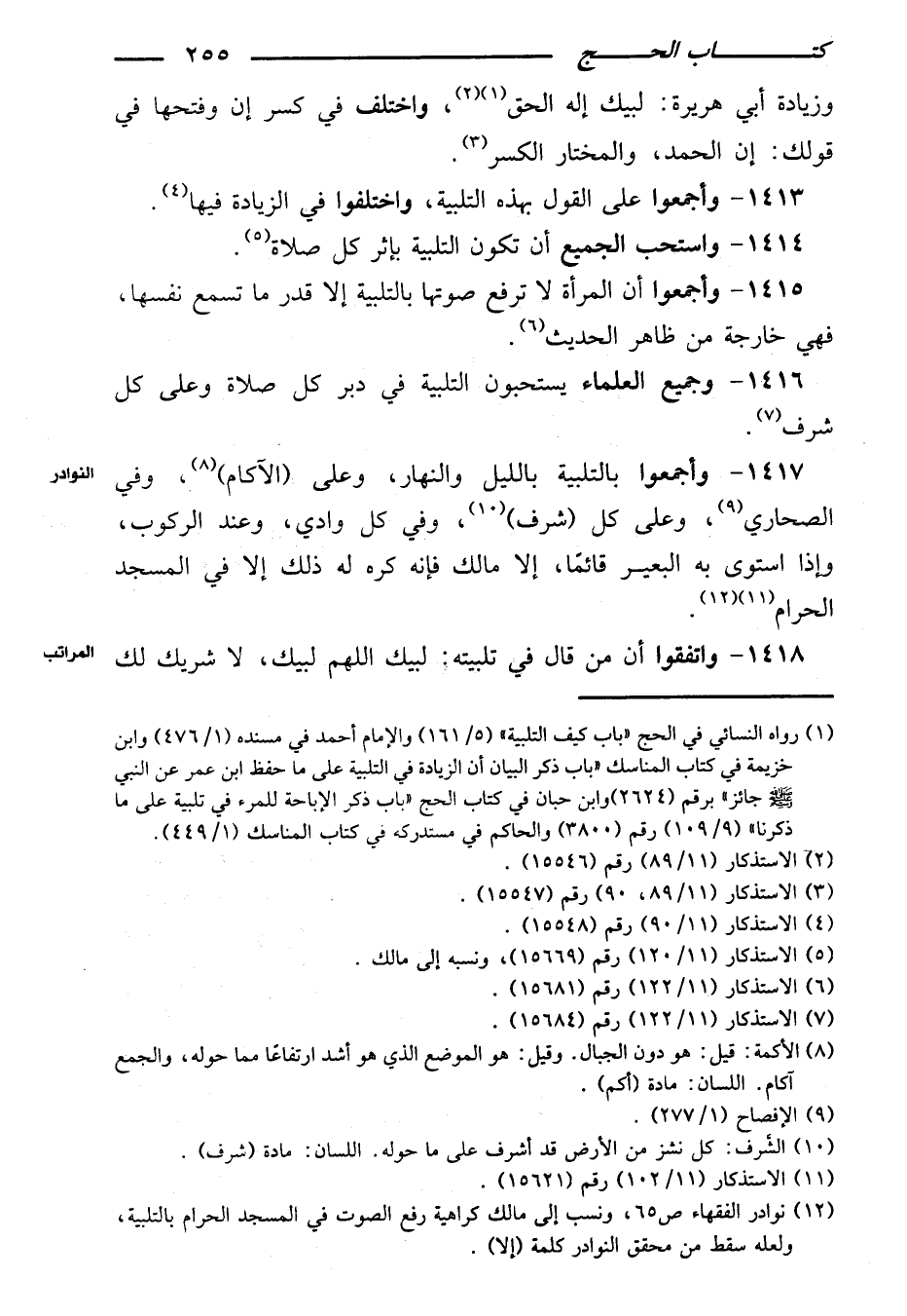 ١٤١٧ - وأجمعوا بالتلبية بالليل والنهار، وعلى (الآكام)، وفي الصحاري، وعلى كل (شرف)، وفي كل وادي، وعند الركوب، وإذا استوى به البعير قائمًا، إلا مالك فإنه كره له ذلك إلا في المسجد الحرام.