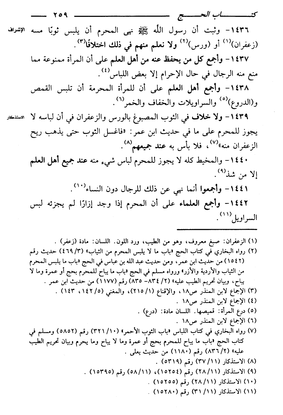١٤٣٦ - وثبت أن رسول الله صلى الله عليه وسلم نهى المحرم أن يلبس ثوبًا مسه (زعفران) أو (ورس) ولا نعلم منهم في ذلك اختلافًا.