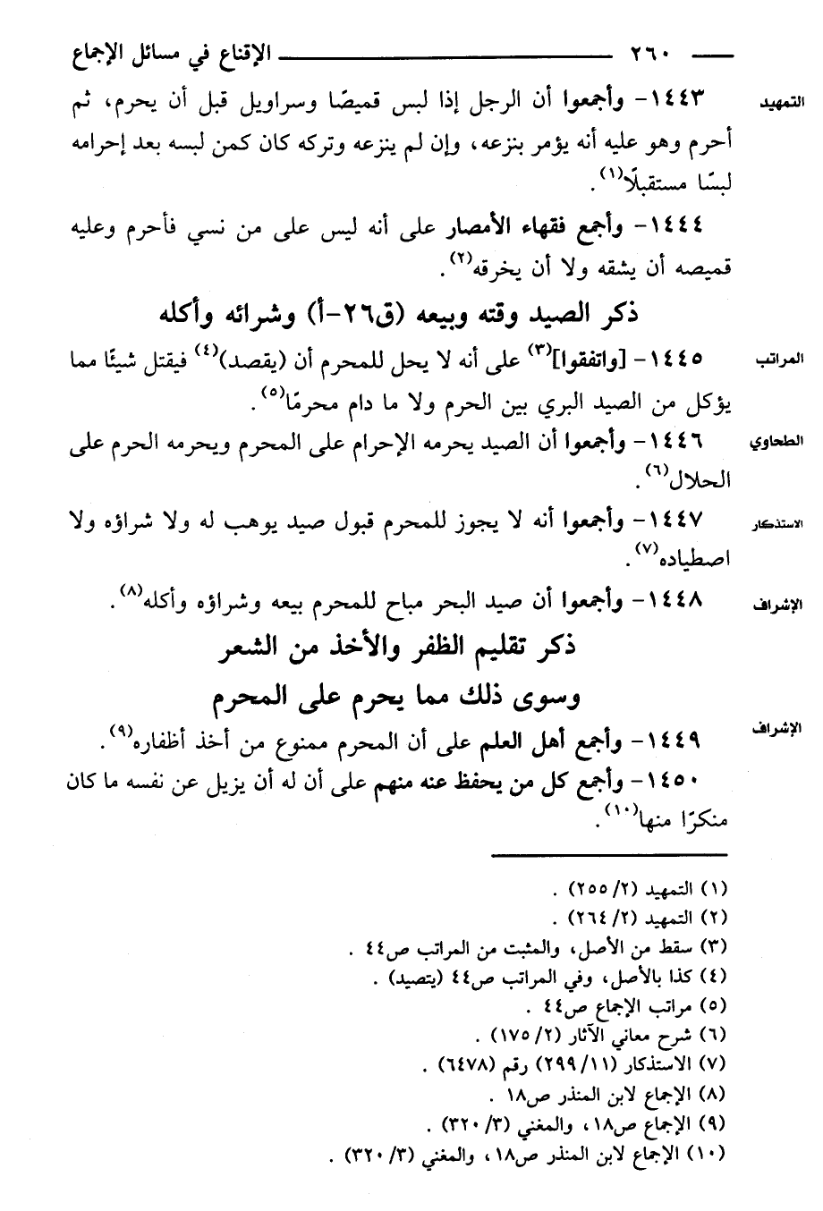 ١٤٤٥ - [واتفقوا] على أنه لا يحل للمحرم أن (يقصد) فيقتل شيئًا مما يؤكل من الصيد البري بين الحرم ولا ما دام محرمًا.