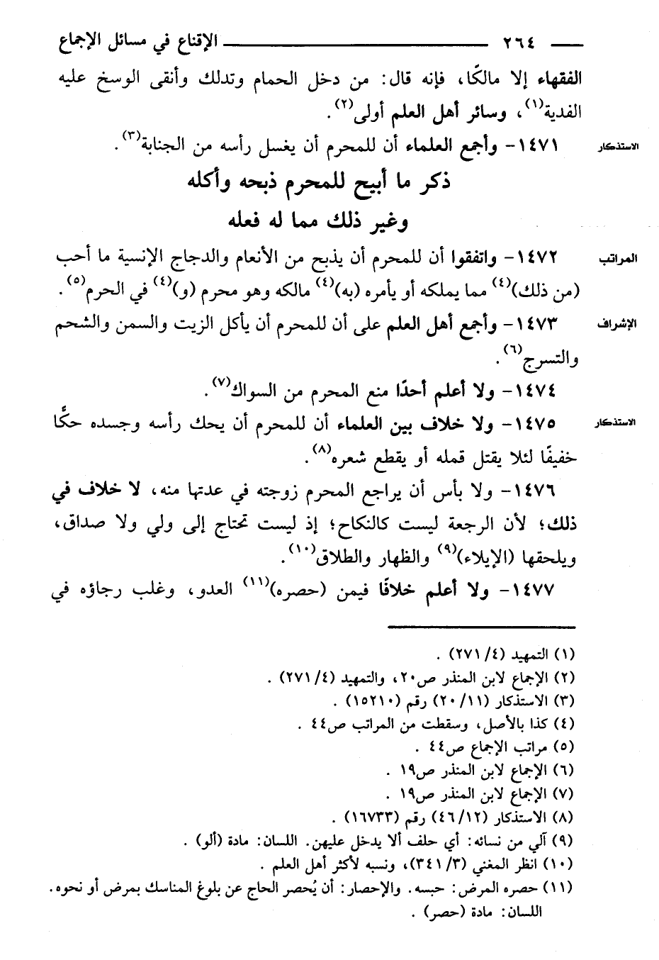 ١٤٧٢ - واتفقوا أن للمحرم أن يذبح من الأنعام والدجاج الإنسية ما أحب (من ذلك) مما يملكه أو يأمره (به) مالكه وهو محرم (و) في الحرم.