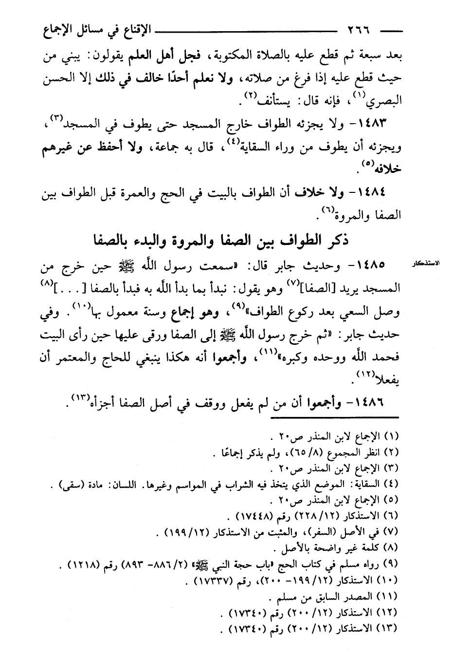 ١٤٨٥ - وحديث جابر قال: «سمعت رسول الله صلى الله عليه وسلم حين خرج من المسجد يريد [الصفا] وهو يقول: نبدأ بما بدأ الله به فبدأ بالصفا [...] وصل السعي بعد ركوع الطواف»، وهو إجماع وسنة معمول بها. وفي حديث جابر: «ثم خرج رسول الله صلى الله عليه وسلم إلى الصفا ورقى عليها حين رأى البيت فحمد الله ووحده وكبره»، وأجمعوا أنه هكذا ينبغي للحاج والمعتمر أن يفعلا.