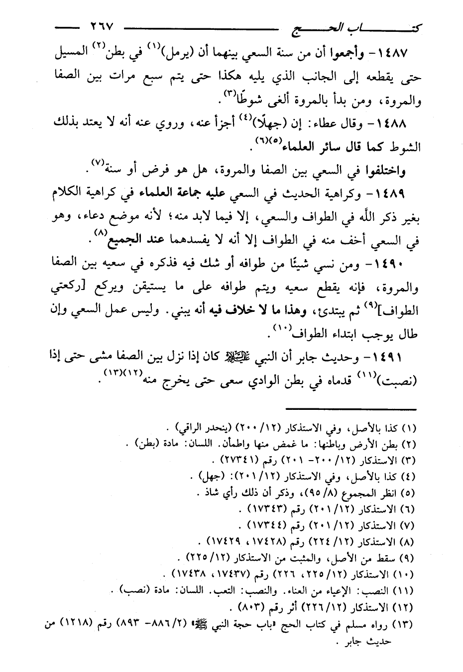 ١٤٨٩ - وكراهية الحديث في السعي عليه جماعة العلماء في كراهية الكلام بغير ذكر الله في الطواف والسعي، إلا فيما لا بد منه؛ لأنه موضع دعاء، وهو في السعي أخف منه في الطواف إلا أنه لا يفسدهما عند الجميع.