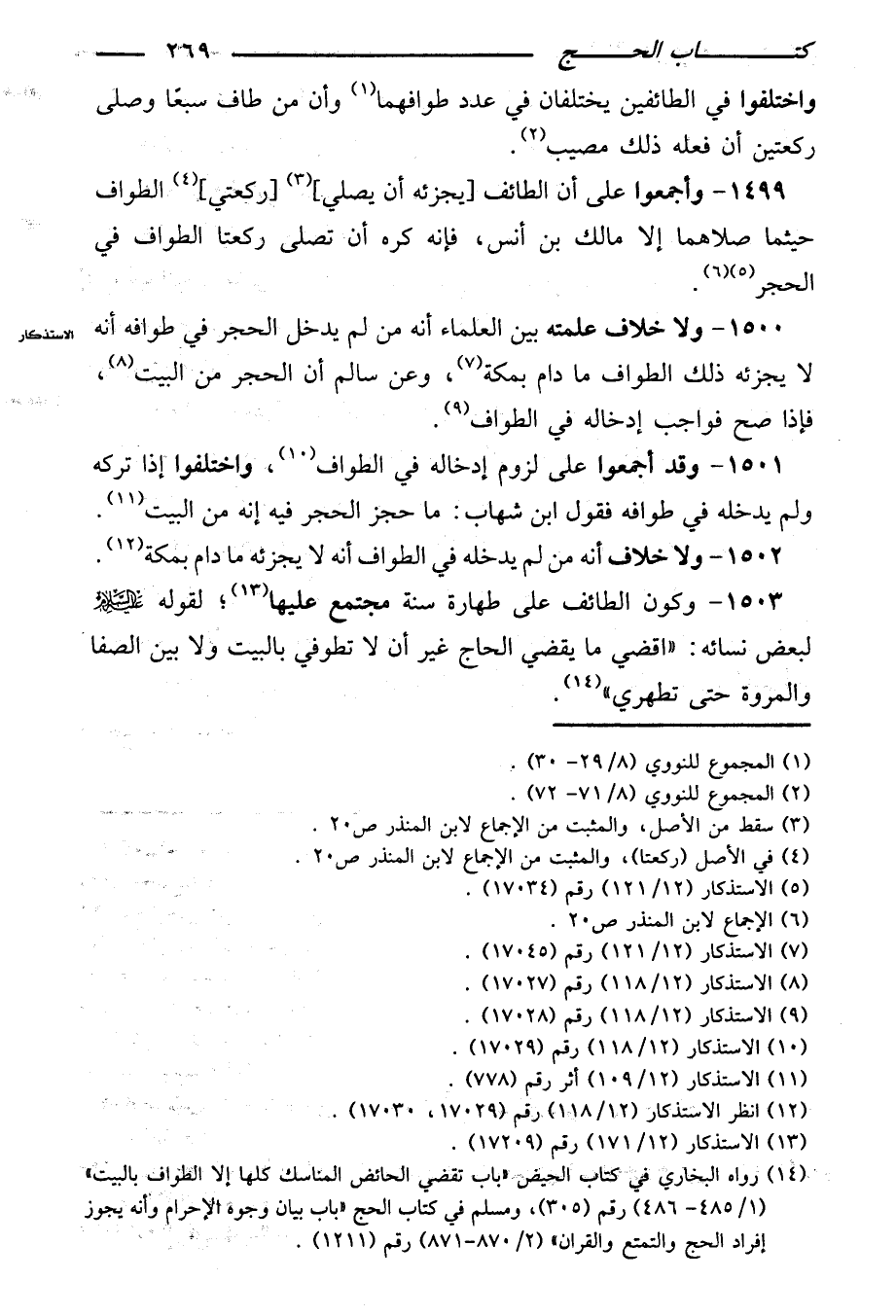 ١٥٠٠ - ولا خلاف علمته بين العلماء أنه من لم يدخل الحجر في طوافه أنه لا يجزئه ذلك الطواف ما دام بمكة، وعن سالم أن الحجر من البيت، فإذا صح فواجب إدخاله في الطواف.