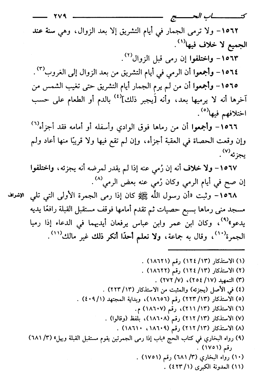 ١٥٦٢ - ولا ترمى الجمار في أيام التشريق إلا بعد الزوال، وهي سنة عند الجميع لا خلاف فيها.