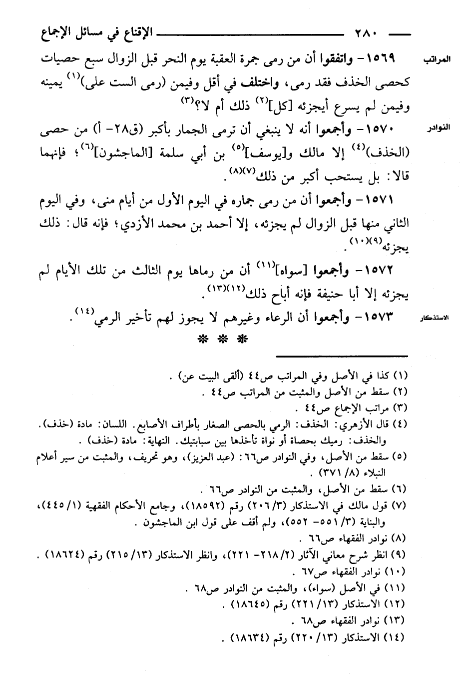 ١٥٧٠ - وأجمعوا أنه لا ينبغي أن ترمي الجمار بأكبر من حصى (الخذف) إلا مالك و [يوسف] بن أبي سلمة [الماجشون]؛ فإنهما قالا: بل يستحب أكبر من ذلك.