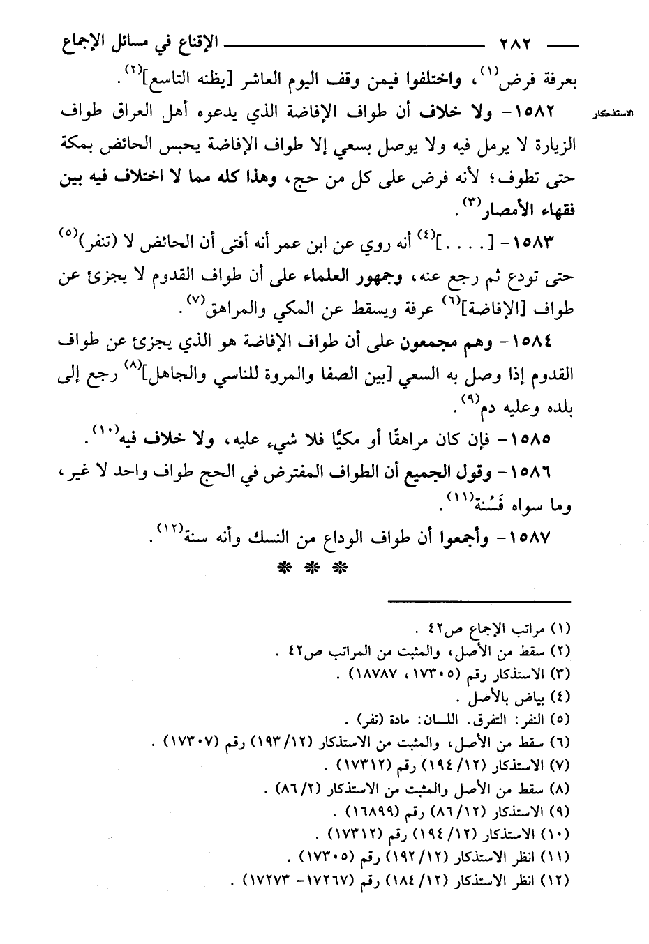 ١٥٨٧ - وأجمعوا أن طواف الوداع من النسك وأنه سنة.