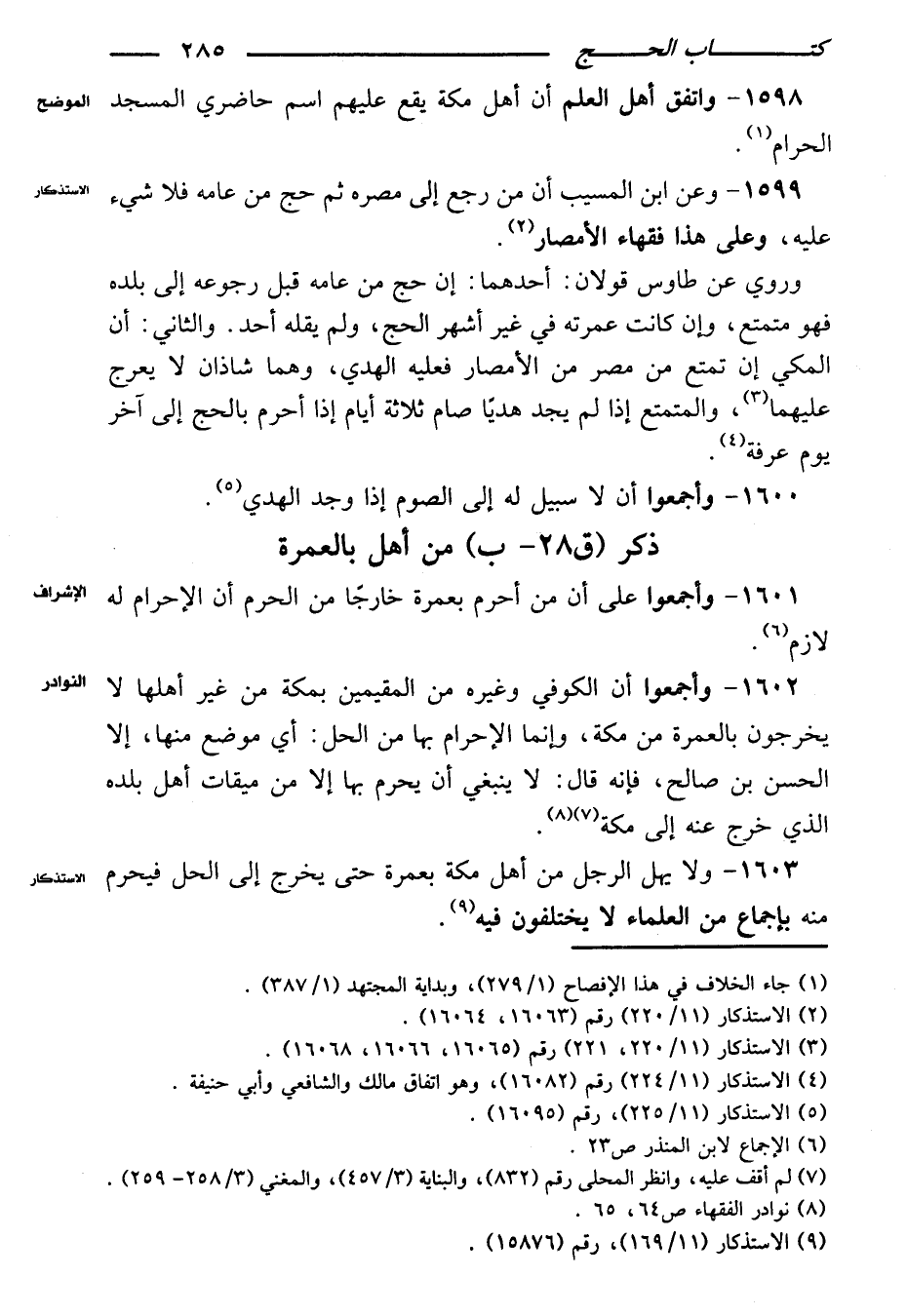 ١٥٩٨ - واتفق أهل العلم أن أهل مكة يقع عليهم اسم حاضري المسجد الحرام.