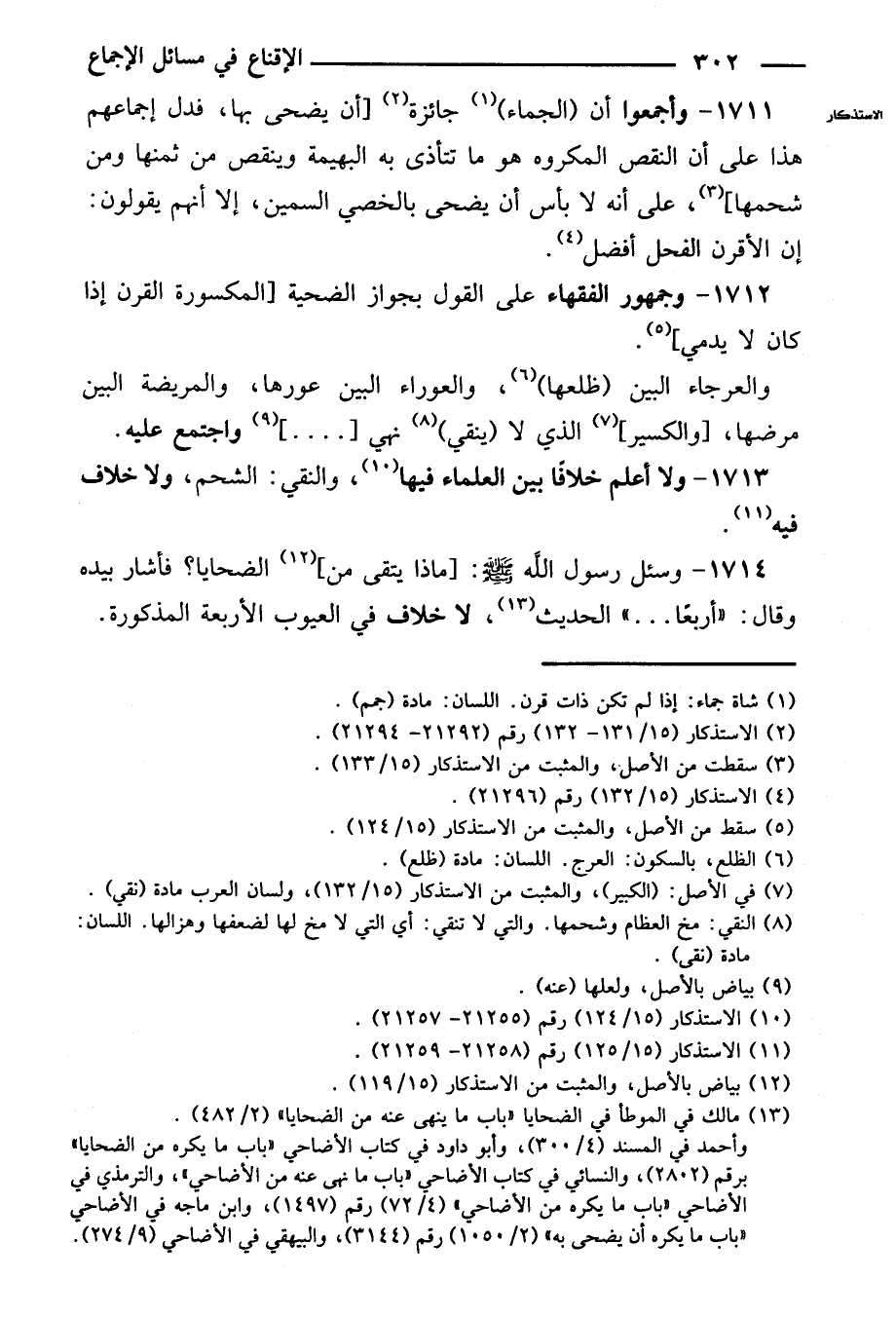 ١٧١١ - وأجمعوا أن (الجماء) جائزة [أن يضحى بها، فدل إجماعهم هذا على أن النقص المكروه هو ما تتأذى به البيهمة وينقص من ثمنها ومن شحمها]، على أنه لا بأس أن يضحى بالخصي السمين، إلا أنهم يقولون: إن الأقرن الفحل أفضل.