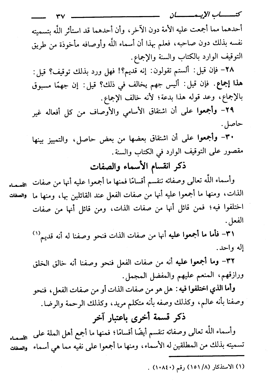 ٣١ - فأما ما أجمعوا عليه أنها من صفات الذات فنحو وصفنا له أنه قديم إله واحد.