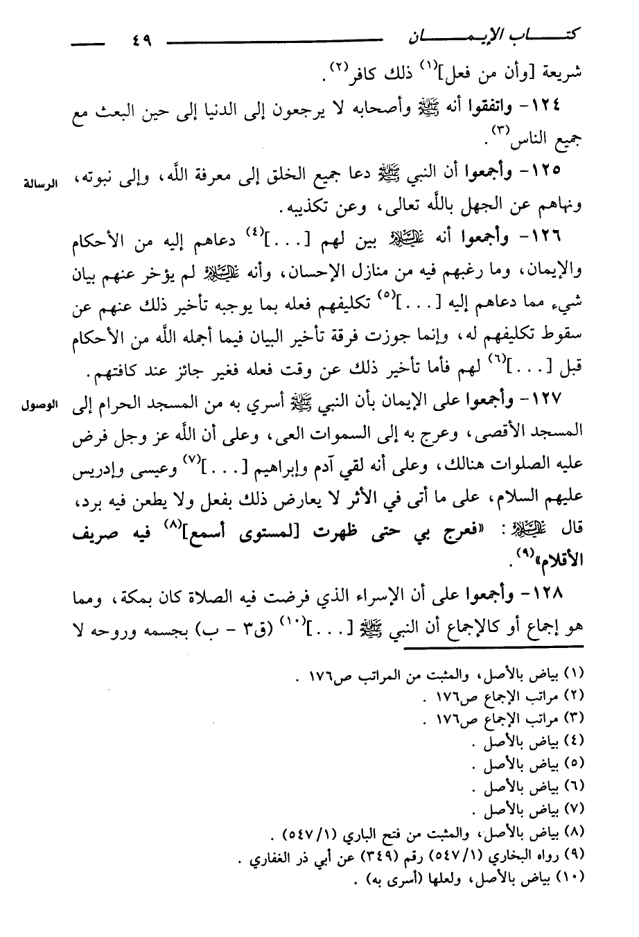 ١٢٨ - وأجمعوا على أن الإسراء الذي فرضت فيه الصلاة كان بمكة، ومما هو إجماع أو كالإجماع أن النبي صلى الله عليه وسلم [...] بجسمه وروحه لا