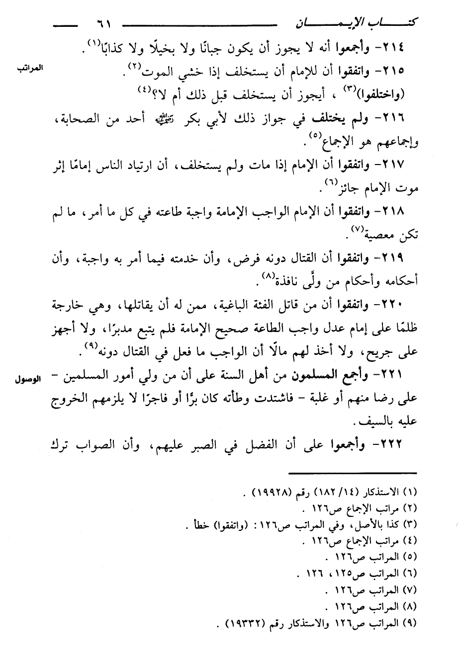 ٢١٨ - واتفقوا أن الإمام واجب الإمامة واجبة طاعته في كل ما أمر، ما لم تكن معصية.