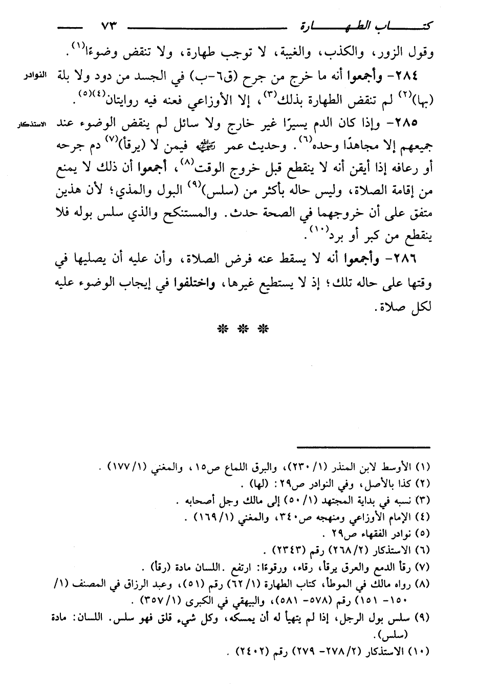 ٢٨٥ - وإذا كان الدم يسيرًا غير خارج ولا سائل لم ينقض الوضوء عند جميعهم إلا مجاهدًا وحده. وحديث عمر رضي الله عنه فيمن لا (يرقأ) دم جرحه أو رعافه إذا أيقن أنه لا ينقطع قبل خروج الوقت، أجمعوا أن ذلك لا يمنع من إقامة الصلاة، وليس حاله بأكثر من (سلسل) البول والمذي؛ لأن هذين متفق على أن خروجهما في الصحة حدث. والمستنكح والذي سلس بوله فلا ينقطع من كبر أو برد.