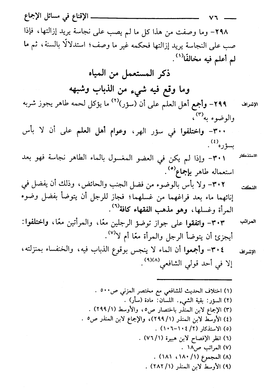 ٢٩٩ - وأجمع أهل العلم على أن (سؤر) ما يؤكل لحمه طاهر يجوز شربه والوضوء به،