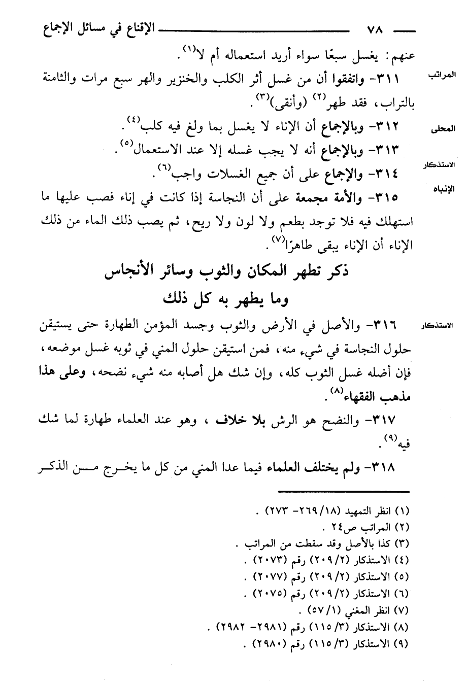٣١٥ - والأمة مجمعة على أن النجاسة إذا كانت في إناء فصب عليها ما استهلك فيه فلا توجد بطعم ولا لون ولا ريح، ثم يصب ذلك الماء من ذلك الإناء أن الإناء يبقى طاهرًا.