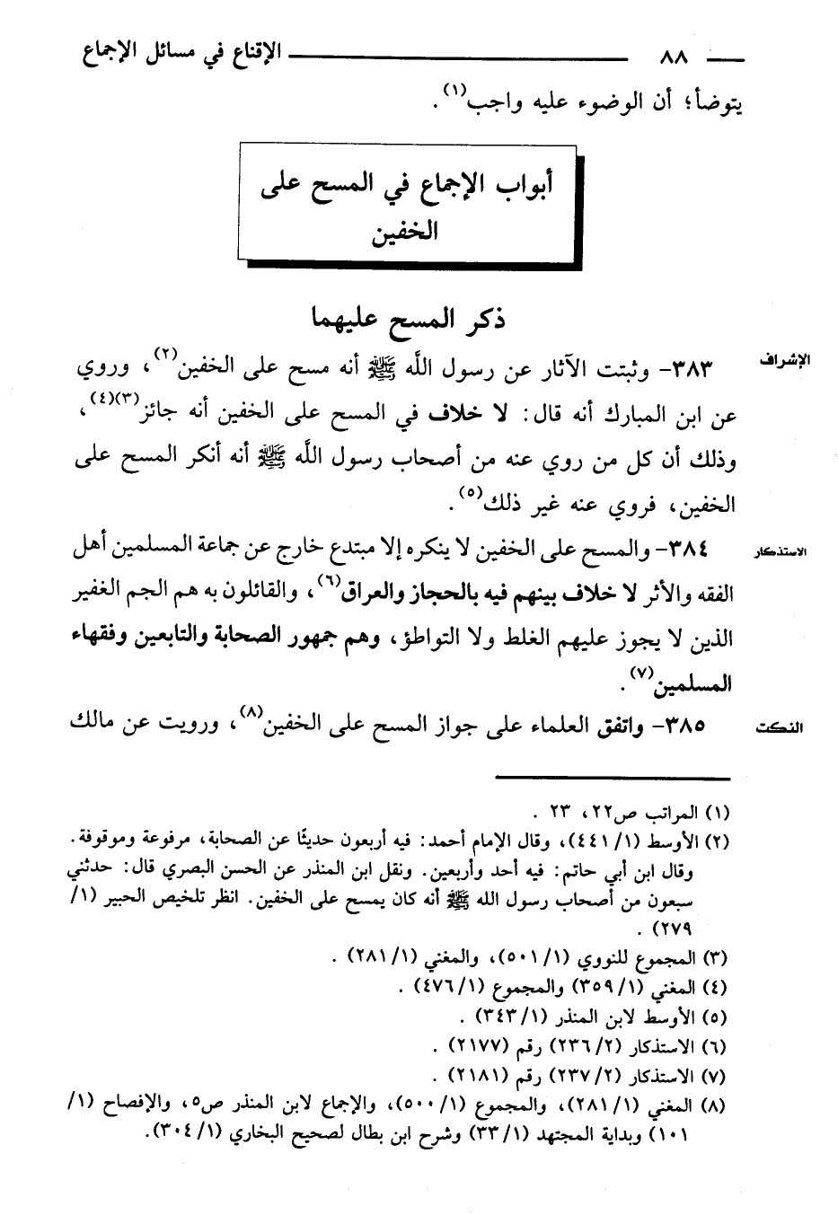 ٣٨٤ - والمسح على الخفين لا ينكره إلا مبتدع خارج عن جماعة المسلمين أهل الفقه والأثر لا خلاف بينهم فيه بالحجاز والعراق، والقائلون به هم الجم الغفير الذين لا يجوز عليهم الغلط ولا التواطؤ، وهم جمهور الصحابة والتابعين وفقهاء المسلمين.