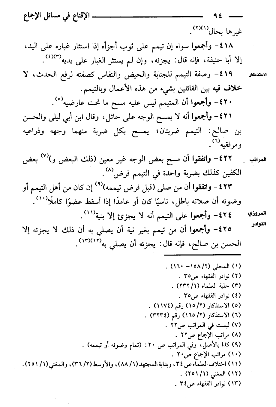 ٤٢٥ - وأجمعوا أن من تيمم بغير نية أن يصلي به أن ذلك لا يجزئه إلا الحسن بن صالح، فإنه قال: يجزئه أن يصلي به.