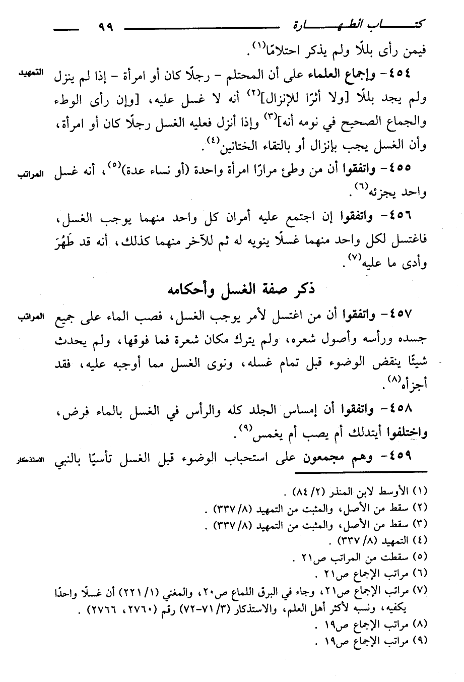٤٥٤ - وإجماع العلماء على أن المحتلم - رجلاً كان أو امرأة - إذا لم ينزل ولم يجد بللاً [ولا أثرًا للإنزال] أنه لا غسل عليه، [وإن رأى الوطء والجماع الصحيح في نومه أنه] وإذا أنزل فعليه الغسل رجلاً كان أو امرأة، وأن الغسل يجب بإنزال أو بالتقاء الختانين.