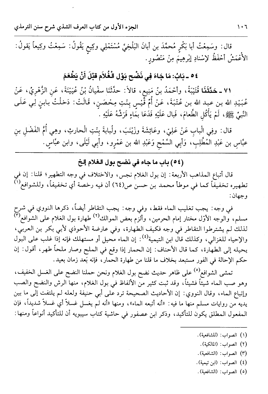 [71] قال أتباع المذاهب الأربعة: إن بول الغلام نجس، والاختلاف في وجه التطهير؛ قلنا: إن في تطهيره تخفيفاً كما في موطأ محمد بن حسن ص (64) أن فيه رخصة أي تخفيفاً، وللشوافع وجهان: