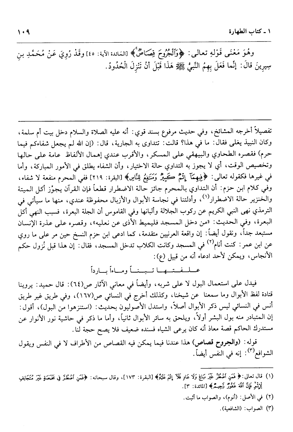 تفصيلاً أخرجه المشائخ، وفي حديث مرفوع بسند قوي: أنه عليه الصلاة والسلام دخل بيت أم سلمة، وكان النبيذ يغلى فقال: ما في هذا؟ قالت: تتداوى به الجارية، قال: (إن الله لم يجعل شفاءكم فيما حرم) فقصره الطحاوي والبيهقي على المسكر، والأقرب عندي إهمال الألفاظ عامة على حالها وتخصيص الوقت، أي لا يجوز به التداوي حالة الاختيار، وأن الشفاء يطلق في الأمور المباركة، وأما في غيرها فكقوله تعالى: {فِيهِمَا إِثْمٌ كَبِيرٌ وَمَنَافِعُ لِلنَّاسِ} [البقرة: 219] ففي المحرم منفعة لا شفاء، وفي كلام ابن حزم: أن التداوي بالمحرم جائز حالة الاضطرار قطعاً فإن القرآن يجوِّز أكل الميتة والخنزير حالة الاضطرار، وأدلتنا في نجاسة الأبوال والأزبال محفوظة عندي، منها ما سيأتي في الترمذي نهى النبي الكريم عن ركوب الجلالة وألبانها وفي القاموس أن الجلة البعرة، فسبب النهي أكل البعرة، وفي الحديث: «من دخل المسجد فليميط الأذى عن نعليه» ، وقصره على عذرة الإنسان مستبعد جداً، ونقول أيضاً: إن واقعة العرنيين متقدمة، كما ادعى ابن حزم النسخ حين مر على ما روي عن ابن عمر: كنت أنام في المسجد وكانت الكلاب تدخل المسجد، فقال: إن هذا قبل نُزول حكم الأنجاس، ويمكن لأحد ادعاء أنه من قبيل: