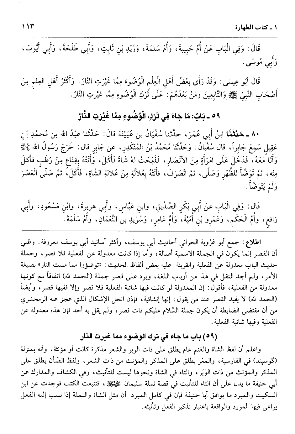 اطلاع: جمع أبو عَرُوبة الحراني أحاديث أبي يوسف، وأكثر أسانيد أبي يوسف معروفة. وظني أن القصر إنما يكون في الجملة الاسمية أصالة، وأما إذا كانت معدولة عن الفعلية فلا قصر، وجملة حديث الباب معدولة عن الفعلية والقرينة عليه بعض ألفاظ الحديث: «توضؤوا مما مست النار» بصيغة الأمر، ولم أجد النقل في هذا من أرباب اللغة، ويرد على قصر جملة (الحمد لله) اتفاقاً مع كونها معدولة من الفعلية، فأقول: إن المعدولة لو كانت فيها شائبة الفعلية فلا قصر وإلا ففيها قصر، وأيضاً (الحمد لله) لا يفيد القصر عند من يقول: إنها إنشائية، فإذن انحل الإشكال الذي عجز عنه الزمخشري من أن مقتضى الضابطة أن يكون جملة السَّلام عليكم ذات قصر، ولم يقل به أحد فإن هذه معدولة عن الفعلية وفيها شائبة الفعلية.