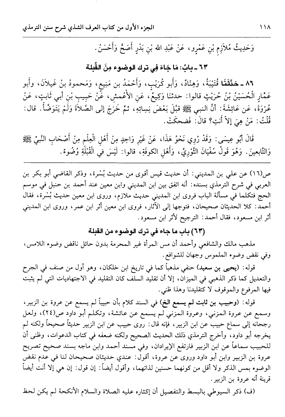ص (16) عن علي بن المديني: أن حديث قيس أقوى من حديث بُسْرة، وذكر القاضي أبو بكر بن العربي في شرح الترمذي بسنده: أنه اتفق بين ابن المديني وابن معين عند أحمد بن حنبل في موسم الحج فتكلما في مسألة الباب فروى ابن المديني حديث ملازم، وروى ابن معين حديث بُسْرة، فقال أحمد: كلا الحديثان صحيحان، فتوجها إلى الآثار، فروى ابن معين أثر ابن عمر، وروى ابن المديني أثر ابن مسعود، فقال أحمد: الترجيح لأثر ابن مسعود.