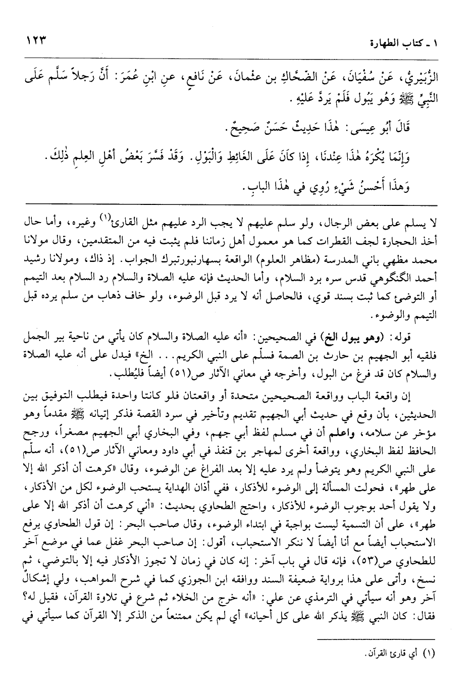إن واقعة الباب وواقعة الصحيحين متحدة أو واقعتان فلو كانتا واحدة فيطلب التوفيق بين الحديثين، بأن وقع في حديث أبي الجهيم تقديم وتأخير في سرد القصة فذكر إتيانه - صَلَّى اللهُ عَلَيْهِ وَسَلَّمَ - مقدماً وهو مؤخر عن سلامه، واعلم أن في مسلم لفظ أبي جهم، وفي البخاري أبي الجهيم مصغراً، ورجح الحافظ لفظ البخاري، وواقعة أخرى لمهاجر بن قنفذ في أبي داود ومعاني الآثار ص (51) ، أنه سلّم على النبي الكريم وهو يتوضأ ولم يرد عليه إلا بعد الفراغ عن الوضوء، وقال «كرهت أن أذكر الله إلا على طهر» ، فحولت المسألة إلى الوضوء للأذكار، ففي أذان الهداية يستحب الوضوء لكل من الأذكار، ولا يقول أحد بوجوب الوضوء للأذكار، واحتج الطحاوي بحديث: «أني كرهت أن أذكر الله إلا على طهر» ، على أن التسمية ليست بواجبة في ابتداء الوضوء، وقال صاحب البحر: إن قول الطحاوي يرفع الاستحباب أيضاً مع أنا أيضاً لا ننكر الاستحباب، أقول: إن صاحب البحر غفل عما في موضع آخر للطحاوي ص (53) ، فإنه قال في باب آخر: إنه كان في زمان لا تجوز الأذكار فيه إلا بالتوضي، ثم نسخ، وأتى على هذا برواية ضعيفة السند ووافقه ابن الجوزي كما في شرح المواهب، ولي إشكالٌ آخر وهو أنه سيأتي في الترمذي عن علي: «أنه خرج من الخلاء ثم شرع في تلاوة القرآن، فقيل له؟ فقال: كان النبي - صَلَّى اللهُ عَلَيْهِ وَسَلَّمَ - يذكر الله على كل أحيانه» أي لم يكن ممتنعاً من الذكر إلا القرآن كما سيأتي في