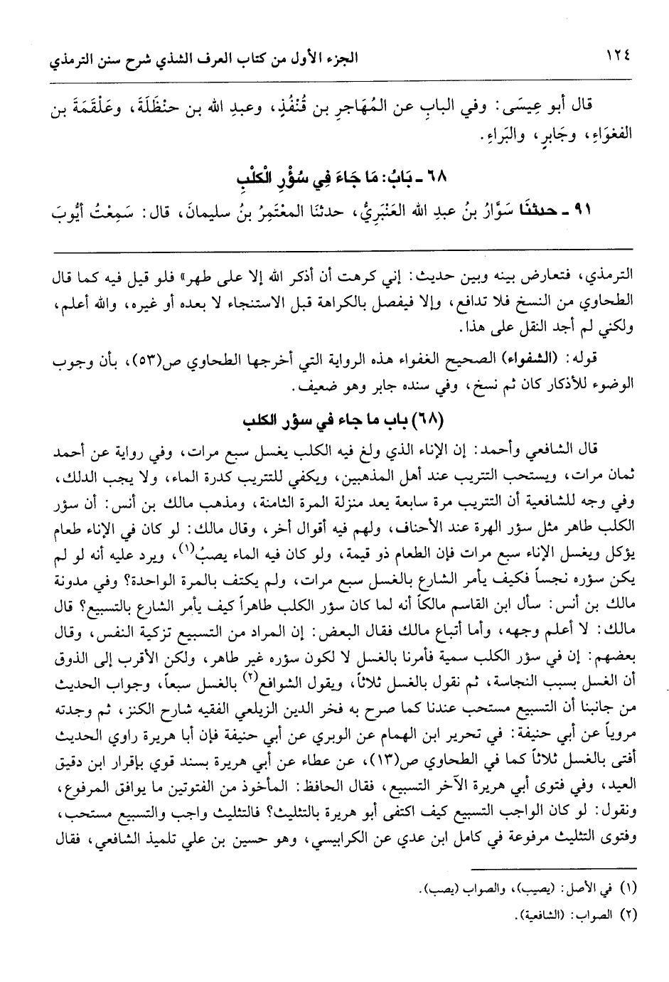 [91] قال الشافعي وأحمد: إن الإناء الذي ولغ فيه الكلب يغسل سبع مرات، وفي رواية عن أحمد ثمان مرات، ويستحب التتريب عند أهل المذهبين، ويكفي للتتريب كدرة الماء، ولا يجب الدلك، وفي وجه للشافعية أن التتريب مرة سابعة يعد منزلة المرة الثامنة، ومذهب مالك بن أنس: أن سؤر الكلب طاهر مثل سؤر الهرة عند الأحناف، ولهم فيه أقوال أخر، وقال مالك: لو كان في الإناء طعام يؤكل ويغسل الإناء سبع مرات فإن الطعام ذو قيمة، ولو كان فيه الماء يصبُ، ويرد عليه أنه لو لم يكن سؤره نجساً فكيف يأمر الشارع بالغسل سبع مرات، ولم يكتف بالمرة الواحدة؟ وفي مدونة مالك بن أنس: سأل ابن القاسم مالكاً أنه لما كان سؤر الكلب طاهراً كيف يأمر الشارع بالتسبيع؟ قال مالك: لا أعلم وجهه، وأما أتباع مالك فقال البعض: إن المراد من التسبيع تزكية النفس، وقال بعضهم: إن في سؤر الكلب سمية فأمرنا بالغسل لا لكون سؤره غير طاهر، ولكن الأقرب إلى الذوق أن الغسل بسبب النجاسة، ثم نقول بالغسل ثلاثاً، ويقول الشوافع بالغسل سبعاً، وجواب الحديث من جانبنا أن التسبيع مستحب عندنا كما صرح به فخر الدين الزيلعي الفقيه شارح الكنز، ثم وجدته مروياً عن أبي حنيفة: في تحرير ابن الهمام عن الوبري عن أبي حنيفة فإن أبا هريرة راوي الحديث أفتى بالغسل ثلاثاً كما في الطحاوي ص (13) ، عن عطاء عن أبي هريرة بسند قوي بإقرار ابن دقيق العيد، وفي فتوى أبي هريرة الآخر التسبيع، فقال الحافظ: المأخوذ من الفتوتين ما يوافق المرفوع، ونقول: لو كان الواجب التسبيع كيف اكتفى أبو هريرة بالتثليث؟ فالتثليث واجب والتسبيع مستحب، وفتوى التثليث مرفوعة في كامل ابن عدي عن الكرابيسي، وهو حسين بن علي تلميذ الشافعي، فقال