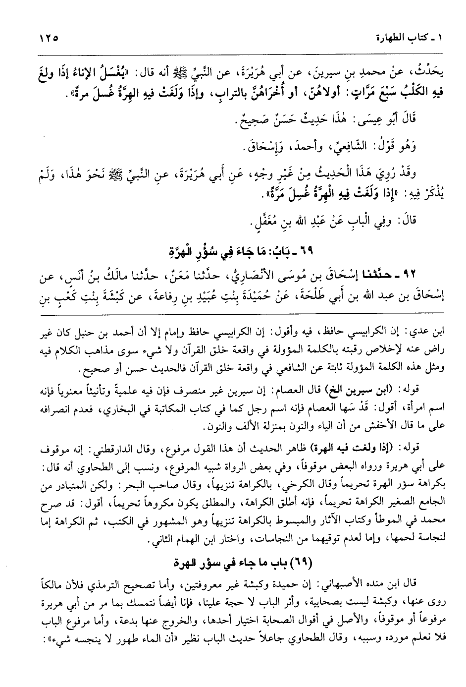 [92] قال ابن منده الأصبهاني: إن حميدة وكبشة غير معروفتين، وأما تصحيح الترمذي فلأن مالكاً روى عنها، وكبشة ليست بصحابية، وأثر الباب لا حجة علينا، فإنا أيضاً نتمسك بما مر من أبي هريرة مرفوعاً أو موقوفاً، والأصل في أقوال الصحابة اختيار أحدها، والخروج عنها بدعة، وأما مرفوع الباب فلا نعلم مورده وسببه، وقال الطحاوي جاعلاً حديث الباب نظير «أن الماء طهور لا ينجسه شيء» :