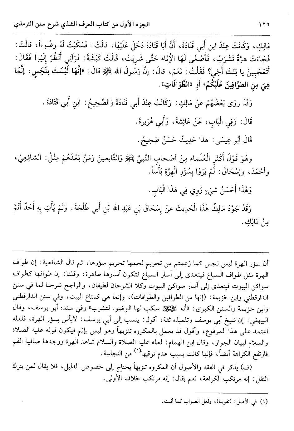 أن سؤر الهرة ليس نجس كما زعمتم من تحريم لحمها تحريم سؤرها، ثم قال الشافعية: إن طواف الهرة مثل طواف السباع فيتعدى إلى آسار السباع فتكون آسارها طاهرة، وقلنا: إن طوافها كطواف سواكن البيوت فيتعدى إلى آسار سواكن البيوت وكلا الشرحان لطيفان، والراجح شرحنا لما في سنن الدارقطني وابن خزيمة: (إنها من الطوافين والطوافات) ، وإنما هي كمتاع البيت، وفي سنن الدارقطني وابن خزيمة والسنن الكبرى: «أنه سكب لها الوضوء لتشرب» وفي سنده أبو يوسف، وقال البيهقي: إن شيخ أبي يوسف وتلميذه ثقة، أقول: ينسب إلى أبي يوسف: لابأس بسؤر الهرة، فلعله اعتمد على هذا المرفوع، وأقول قد يعمل بالمكروه تنزيهاً وهو ليس بإثم فيكون قوله عليه الصلاة والسلام لبيان الجواز، وقال ابن الهمام: لعله عليه الصلاة والسلام شاهد الهرة ووجدها صافية الفم فارتفع الكراهة أيضاً، فإنها كانت بسبب عدم توقيها من النجاسة.