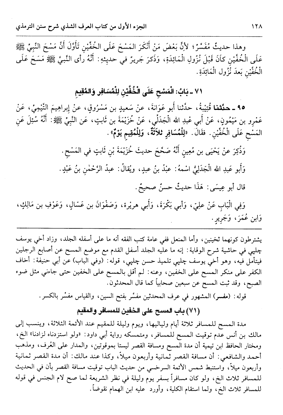 [95] مدة المسح للمسافر ثلاثة أيام ولياليها، ويوم وليلة للمقيم عند الأئمة الثلاثة، وينسب إلى مالك بن أنس عدم توقيت المسح للمسافر، ومتمسكه رواية أبي داود: «ولو استزدناه لزادنا» الخ، ومختار الحافظ ابن تيمية أن مدة المسح ومسافة القصر ليستا بموقوتين، والمدار على العُرف، ومذهب أحمد والشافعي: أن مسافة القصر ثمانية وأربعون ميلاً، وكذا عند مالك: أن مدة القصر ثمانية وأربعون ميلاً، واستنبط شمس الأئمة السرخسي من حديث الباب توقيت مسافة القصر بأن في الحديث للمسافر ثلاث الخ، ولو كان مسافراً بسفر يوم وليلة في نظر الشريعة لما صح لام الجنس في قوله للمسافر ثلاث الخ، ولما استقام الكلية، وأورد عليه ابن الهمام نقوضاً.