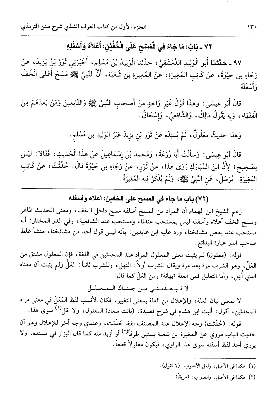 [97] زعم الشيخ ابن الهمام أن المراد من المسح أسلفه مسح داخل الخف، ومعنى الحديث ظاهر ومسح الخف أعلاه وأسفله ليس بمستحب عندنا، ومستحب عند الشافعية، وفي الدر المختار: أنه مستحب عند بعض مشائخنا، ورد عليه ابن عابدين: بأنه ليس قول أحد من مشائخنا، منشأ غلط صاحب الدر عبارة البدائع.