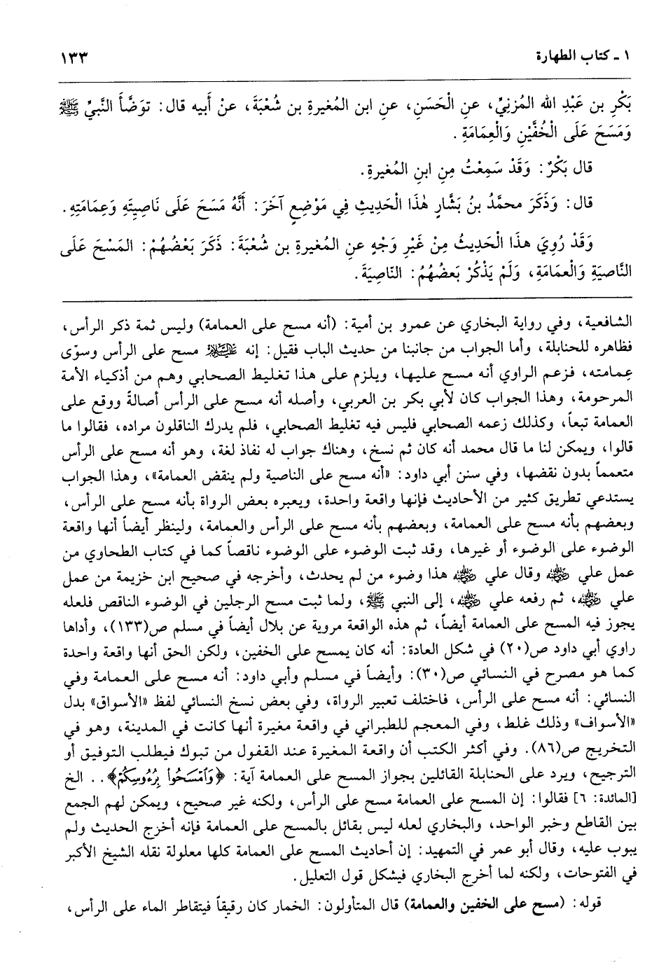 الشافعية، وفي رواية البخاري عن عمرو بن أمية: (أنه مسح على العمامة) وليس ثمة ذكر الرأس، فظاهره للحنابلة، وأما الجواب من جانبنا من حديث الباب فقيل: إنه مسح على الرأس وسوّى عِمامته، فزعم الراوي أنه مسح عليها، ويلزم على هذا تغليط الصحابي وهم من أذكياء الأمة المرحومة، وهذا الجواب كان لأبي بكر بن العربي، وأصله أنه مسح على الرأس أصالةً ووقع على العمامة تبعاً، وكذلك زعمه الصحابي فليس فيه تغليط الصحابي، فلم يدرك الناقلون مراده، فقالوا ما قالوا، ويمكن لنا ما قال محمد أنه كان ثم نسخ، وهناك جواب له نفاذ لغة، وهو أنه مسح على الرأس متعمماً بدون نقضها، وفي سنن أبي داود: «أنه مسح على الناصية ولم ينقض العمامة» ، وهذا الجواب يستدعي تطريق كثير من الأحاديث فإنها واقعة واحدة، ويعبره بعض الرواة بأنه مسح على الرأس، وبعضهم بأنه مسح على العمامة، وبعضهم بأنه مسح على الرأس والعمامة، ولينظر أيضاً أنها واقعة الوضوء على الوضوء أو غيرها، وقد ثبت الوضوء على الوضوء ناقصاً كما في كتاب الطحاوي من عمل علي وقال علي هذا وضوء من لم يحدث، وأخرجه في صحيح ابن خزيمة من عمل علي، ثم رفعه علي، إلى النبي - صَلَّى اللهُ عَلَيْهِ وَسَلَّمَ -، ولما ثبت مسح الرجلين في الوضوء الناقص فلعله يجوز فيه المسح على العمامة أيضاً، ثم هذه الواقعة مروية عن بلال أيضاً في مسلم ص (133) ، وأداها راوي أبي داود ص (20) في شكل العادة: أنه كان يمسح على الخفين، ولكن الحق أنها واقعة واحدة كما هو مصرح في النسائي ص (30) : وأيضاً في مسلم وأبي داود: أنه مسح على العمامة وفي النسائي: أنه مسح على الرأس، فاختلف تعبير الرواة، وفي بعض نسخ النسائي لفظ «الأسواق» بدل «الأسواف» وذلك غلط، وفي المعجم للطبراني في واقعة مغيرة أنها كانت في المدينة، وهو في التخريج ص (86) . وفي أكثر الكتب أن واقعة المغيرة عند القفول