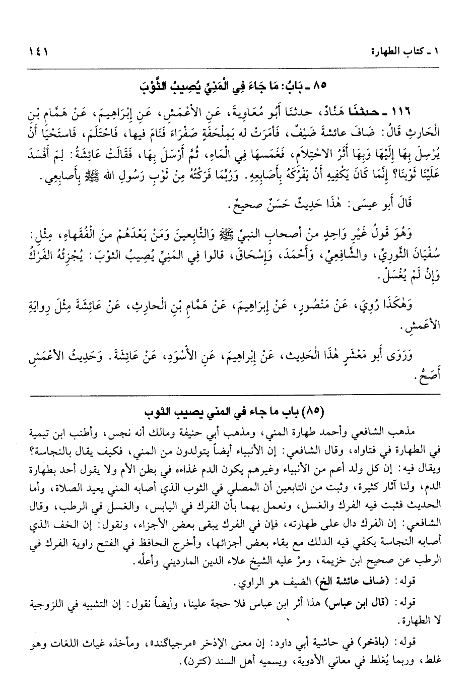 [116] مذهب الشافعي وأحمد طهارة المني، ومذهب أبي حنيفة ومالك أنه نجس، وأطنب ابن تيمية في الطهارة في فتاواه، وقال الشافعي: إن الأنبياء أيضاً يتولدون من المني، فكيف يقال بالنجاسة؟ ويقال فيه: إن كل ولد أعم من الأنبياء وغيرهم يكون الدم غذاءه في بطن الأم ولا يقول أحد بطهارة الدم، ولنا آثار كثيرة، وثبت من التابعين أن المصلي في الثوب الذي أصابه المني يعيد الصلاة، وأما الحديث فثبت فيه الفرك والغسل، ونعمل بهما بأن الفرك في اليابس، والغسل في الرطب، وقال الشافعي: إن الفرك دال على طهارته، فإن في الفرك يبقى بعض الأجزاء، ونقول: إن الخف الذي أصابه النجاسة يكفي فيه الدلك مع بقاء بعض أجزائها، وأخرج الحافظ في الفتح راوية الفرك في الرطب عن صحيح ابن خزيمة، ومرَّ عليه الشيخ علاء الدين المارديني وأعلَّه.