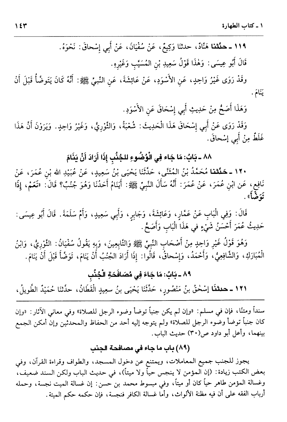 [121] يجوز للجنب جميع المعاملات، ويمتنع عن دخول المسجد، والطواف وقراءة القرآن، وفي بعض الكتب زيادة: (إن المؤمن لا ينجس حياً ولا ميتاً) ، في حديث الباب ولكن السند ضعيف، وغسالة المؤمن طاهر حياً كان أو ميتاً، وفي مبسوط محمد بن حسن: إن غسالة الميت نجسة، وحمله أرباب الفقه على أن فيه مظنة الألواث، وأما غسالة الكافر فنجسة، فإن حكمه حكم الميتة.