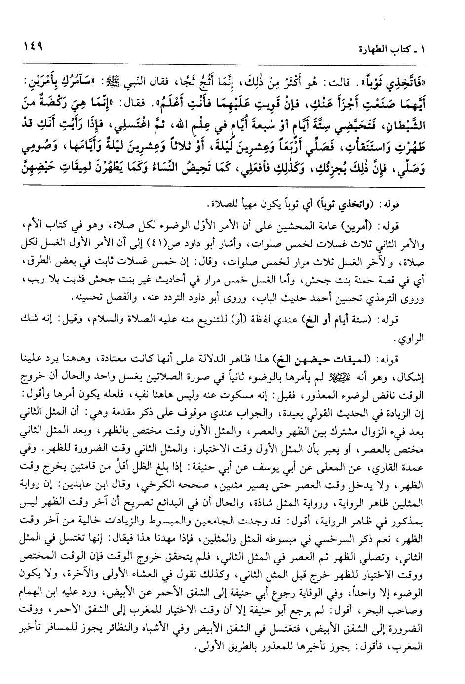 قوله: (لميقات حيضهن الخ) هذا ظاهر الدلالة على أنها كانت معتادة، وهاهنا يرد علينا إشكال، وهو أنه لم يأمرها بالوضوء ثانياً في صورة الصلاتين بغسل واحد والحال أن خروج الوقت ناقض لوضوء المعذور، فقيل: إنه مسكوت عنه وليس هاهنا نفيه، فلعله يكون أمرها وأقول: إن الزيادة في الحديث القولي بعيدة، والجواب عندي موقوف على ذكر مقدمة وهي: أن المثل الثاني بعد فيء الزوال مشترك بين الظهر والعصر، والمثل الأول وقت مختص بالظهر، وبعد المثل الثاني مختص بالعصر، أو يعبر بأن المثل الأول وقت الاختيار، والمثل الثاني وقت الضرورة للظهر. وفي عمدة القاري، عن المعلى عن أبي يوسف عن أبي حنيفة: إذا بلغ الظل أقلَّ من قامتين يخرج وقت الظهر، ولا يدخل وقت العصر حتى يصير مثلين، صححه الكرخي، وقال ابن عابدين: إن رواية المثلين ظاهر الرواية، ورواية المثل شاذة، والحال أن في البدائع تصريح أن آخر وقت الظهر ليس بمذكور في ظاهر الرواية، أقول: قد وجدت الجامعين والمبسوط والزيادات خالية من آخر وقت الظهر، نعم ذكر السرخسي في مبسوطه المثل والمثلين، فإذا مهدنا هذا فيقال: إنها تغتسل في المثل الثاني، وتصلي الظهر ثم العصر في المثل الثاني، فلم يتحقق خروج الوقت فإن الوقت المختص ووقت الاختيار للظهر خرج قبل المثل الثاني، وكذلك نقول في العشاء الأولى والآخرة، ولا يكون الوضوء إلا واحداً، وفي الوقاية رجوع أبي حنيفة إلى الشفق الأحمر عن الأبيض، ورد عليه ابن الهمام وصاحب البحر، أقول: لم يرجع أبو حنيفة إلا أن وقت الاختيار للمغرب إلى الشفق الأحمر، ووقت الضرورة إلى الشفق الأبيض، فتغتسل في الشفق الأبيض وفي الأشباه والنظائر يجوز للمسافر تأخير المغرب، فأقول: يجوز تأخيرها للمعذور بالطريق الأولى.