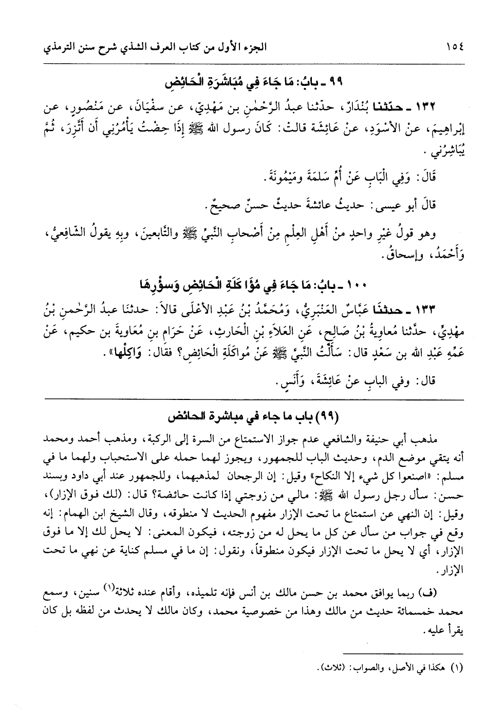 [132] مذهب أبي حنيفة والشافعي عدم جواز الاستمتاع من السرة إلى الركبة، ومذهب أحمد ومحمد أنه يتقي موضع الدم، وحديث الباب للجمهور، ويجوز لهما حمله على الاستحباب ولهما ما في مسلم: «اصنعوا كل شيء إلا النكاح» وقيل: إن الرجحان لمذهبهما، وللجمهور عند أبي داود وبسند حسن: سأل رجل رسول الله - صَلَّى اللهُ عَلَيْهِ وَسَلَّمَ -: مالي من زوجتي إذا كانت حائضة؟ قال: (لك فوق الإزار) ، وقيل: إن النهي عن استمتاع ما تحت الإزار مفهوم الحديث لا منطوقه، وقال الشيخ ابن الهمام: إنه وقع في جواب من سأل عن كل ما يحل له من زوجته، فيكون المعنى: لا يحل لك إلا ما فوق الإزار، أي لا يحل ما تحت الإزار فيكون منطوقاً، ونقول: إن ما في مسلم كناية عن نهي ما تحت الإزار.