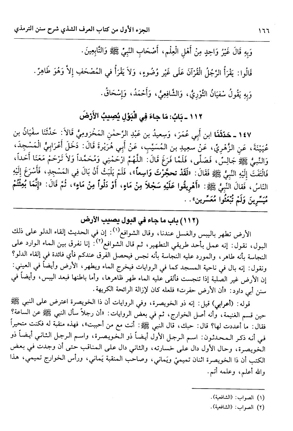 [147] الأرض تطهر باليبس والغسل عندنا، وقال الشوافع: إن في الحديث إلقاء الدلو على ذلك البول، نقول: إنه عمل بأحد طريقي التطهير، ثم قال الشوافع: إنا نفرق بين الماء الوارد على النجاسة بأنه طاهر، والمورد عليه النجاسة بأنه نجس فيحصل الفرق عندكم فأي فائدة في إلقاء الدلو؟ ونقول: إنه بال في ناحية المسجد كما في الروايات فيخرج الماء ويطهر، الأرض وأيضاً في العيني: إن الأرض غير الصلبة إذا تنجست فألقى عليه الماء طهر ظاهرها، وأما باطنها فبعد اليبس، وأيضاً في سنن أبي داود: «أن الأرض حفرت» فلعله كان لإزالة الرائحة الكريهة.