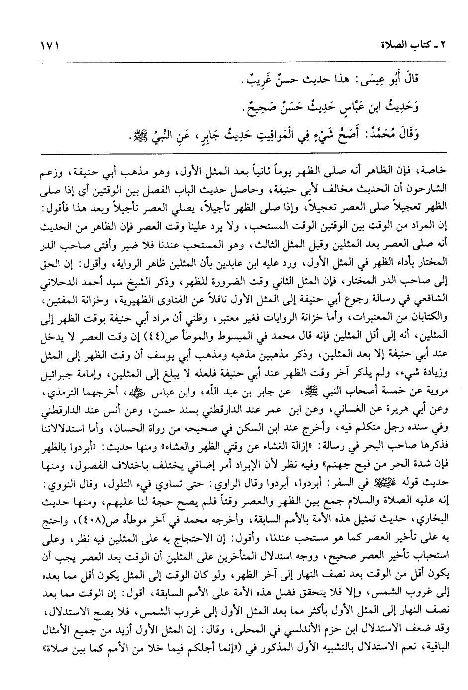 أبردوا، أبردوا وقال الراوي: حتى تساوي فيء التلول، وقال النووي: إنه عليه الصلاة والسلام جمع بين الظهر والعصر وقتاً فلم يصح حجة لنا عليهم، ومنها حديث البخاري، حديث تمثيل هذه الأمة بالأمم السابقة، وأخرجه محمد في آخر موطأه ص (408) ، واحتج به على تأخير العصر كما هو مستحب عندنا، وأقول: إن الاحتجاج به على المثلين فيه نظر، وعلى استحباب تأخير العصر صحيح، ووجه استدلال المتأخرين على المثلين أن الوقت بعد العصر يجب أن يكون أقل من الوقت بعد نصف النهار إلى آخر الظهر، ولو كان الوقت إلى المثل يكون أقل مما بعده إلى غروب الشمس، وإلا فلا يتحقق فضل هذه الأمة على الأمم السابقة، أقول: إن الوقت مما بعد نصف النهار إلى المثل الأول بأكثر مما بعد المثل الأول إلى غروب الشمس، فلا يصح الاستدلال، وقد ضعف الاستدلال ابن حزم الأندلسي في المحلى، وقال: إن المثل الأول أزيد من جميع الأمثال الباقية، نعم الاستدلال بالتشبيه الأول المذكور في ( «إنما أجلكم فيما خلا من الأمم كما بين صلاة»